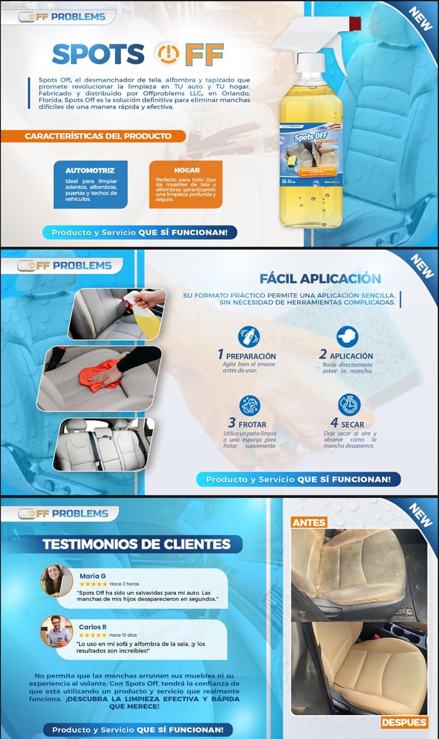 • Fácil aplicación: proceso simple de 4 pasos: agita la botella, rocía directamente sobre la mancha, frota suavemente con un paño limpio o una esponja y deja secar al aire